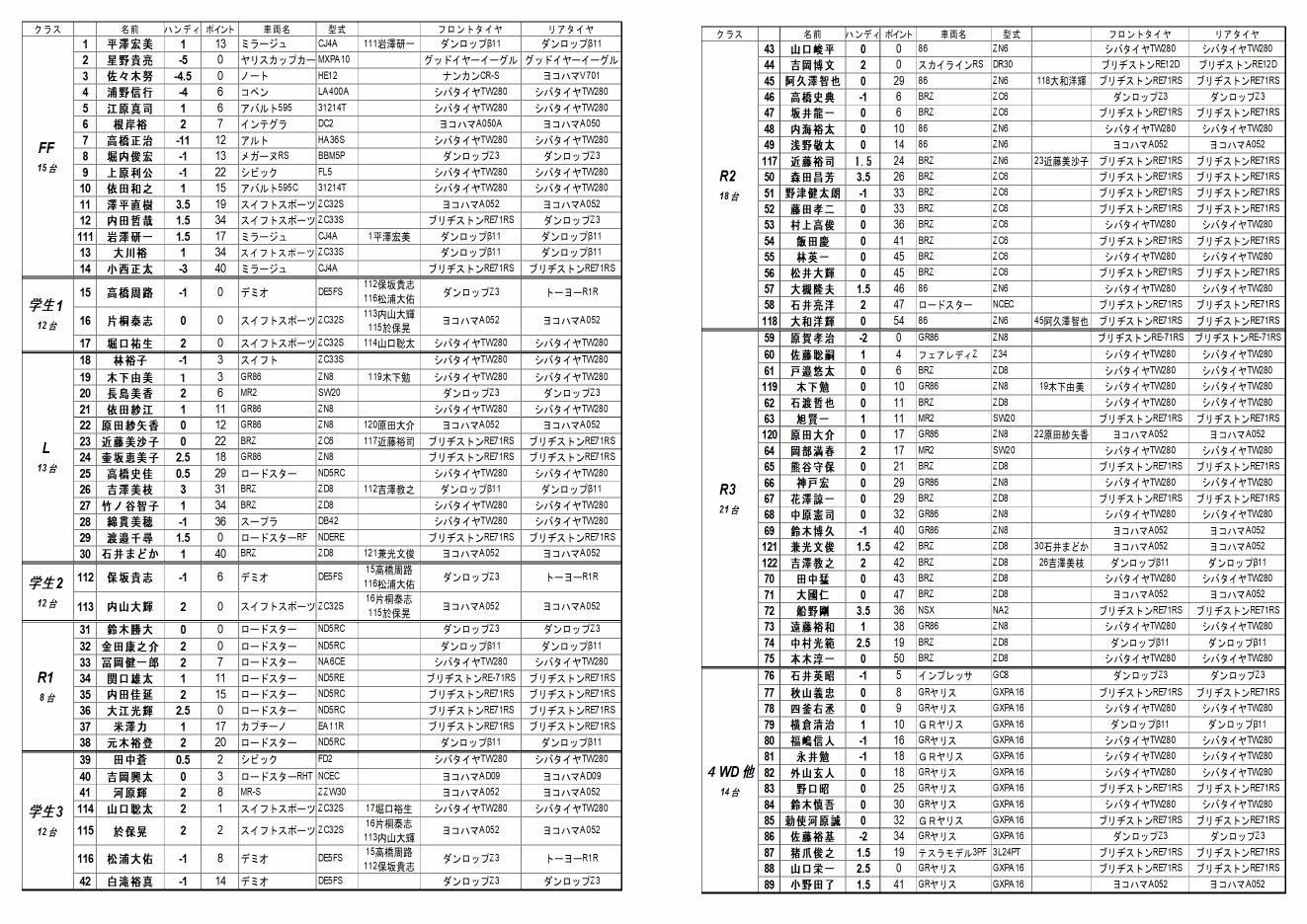 | 参加クラス | 名前 | ハンディ | ポイント | 全戦参加 | 車両名 | 車両型式 | 学校名 | 重複エントリー | フロントタイヤ | リアタイヤ | ||